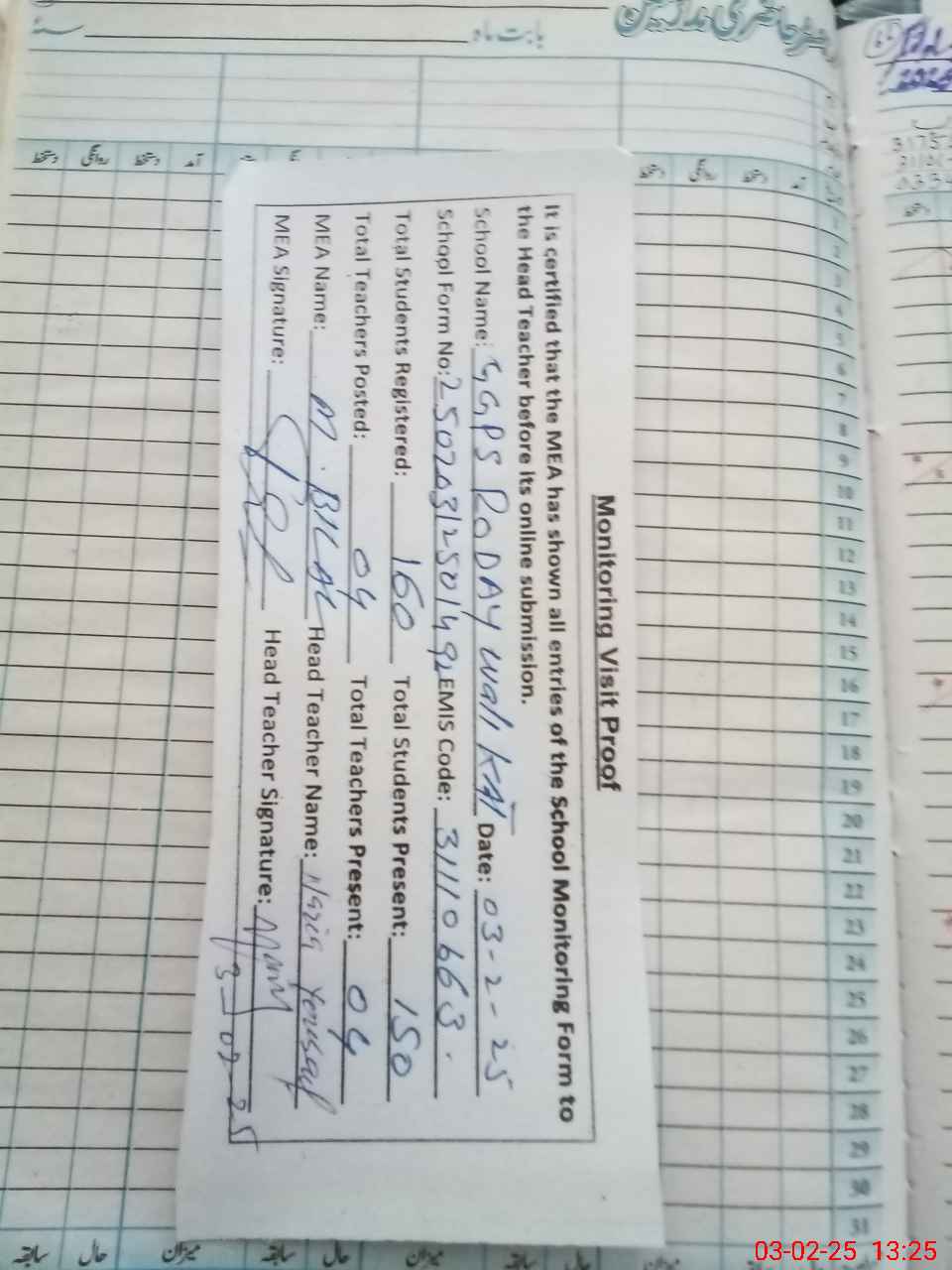 | Attendance Register | Head Teacher | MEA with School | Visit Proof |