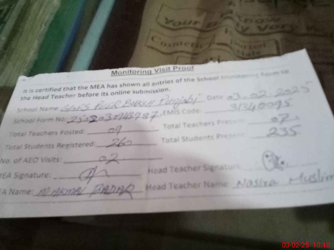 | Total no. of Classrooms: 9 No. of Classrooms Used for Teaching: 8 No. of Classrooms Storing Old Furniture, FTBs, etc: 0Comments if Any: Approved leave of teacher Saba dastgheer pst not Available |