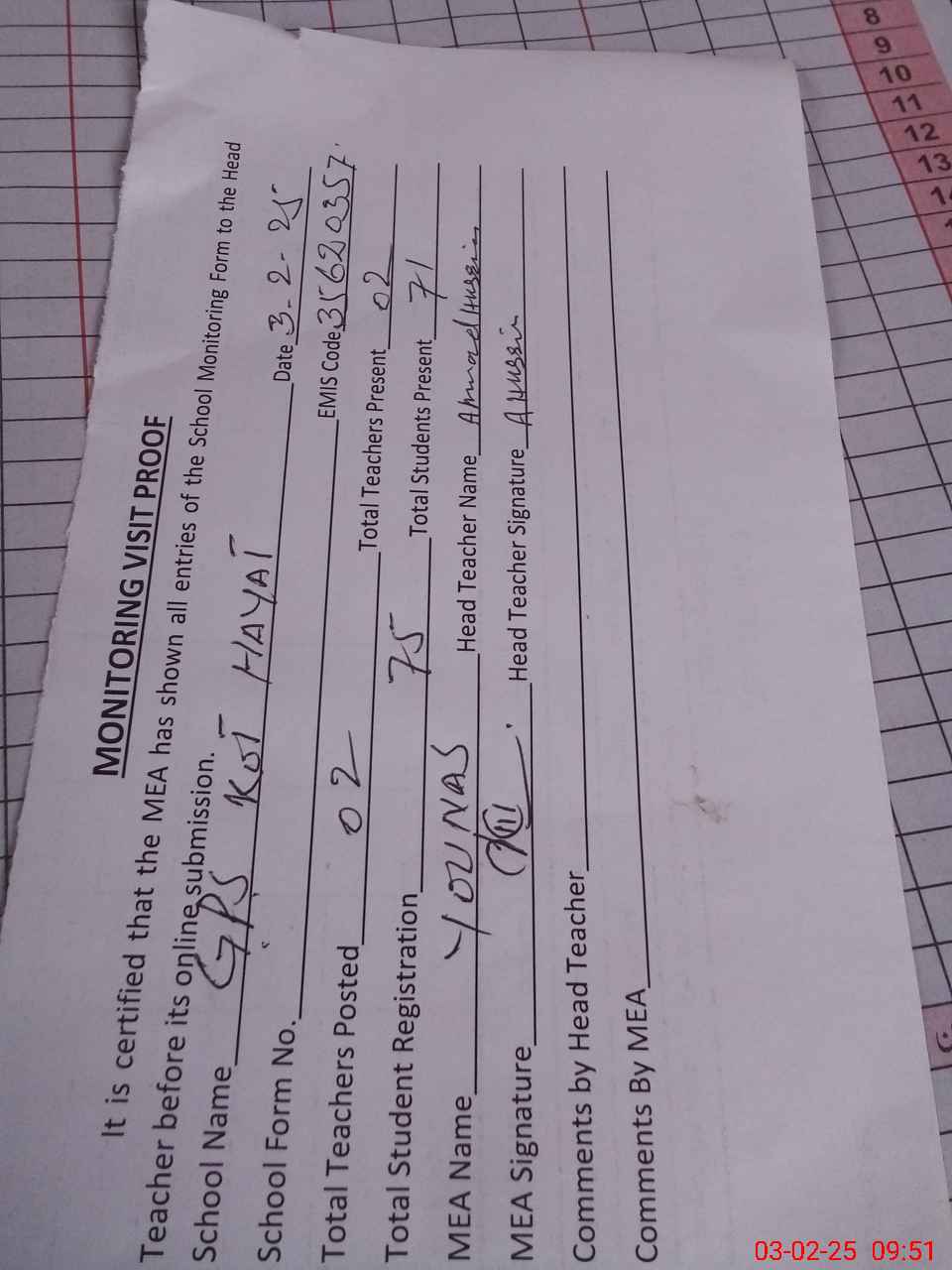| EMIS Code: 35620357 | Name of School: GPS KOT HAYAT KHAN | |||