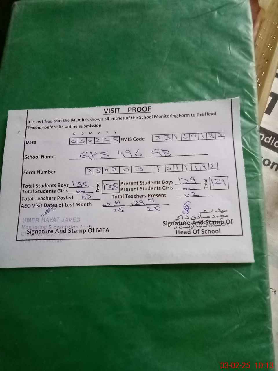 | Attendance Register | Head Teacher | MEA with School | Visit Proof |