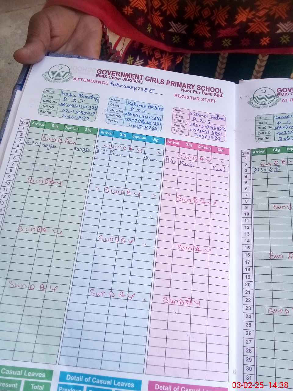 | CNIC | Full Name | Designation | R/C | Absence During Last Calender Month |
