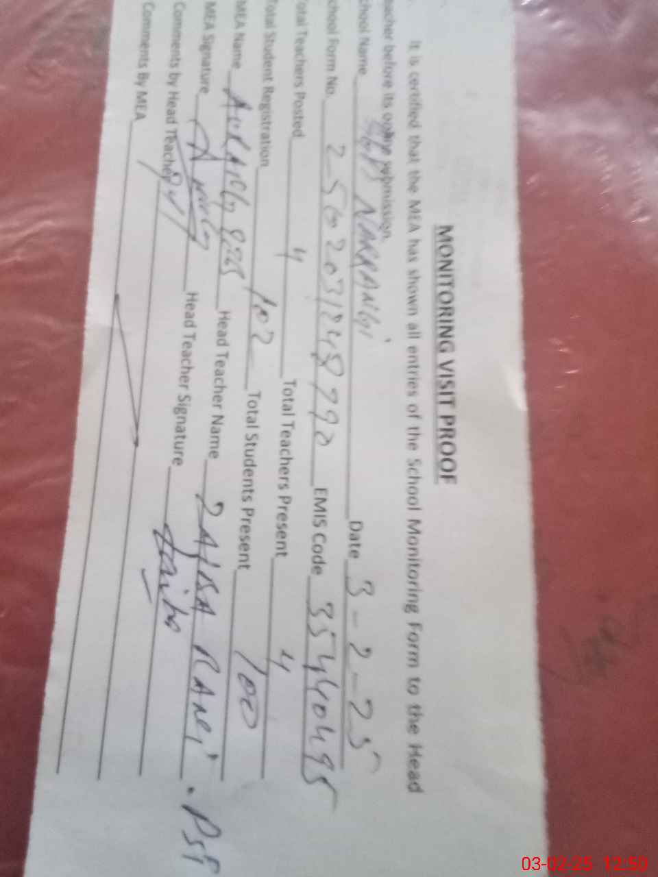 | Attendance Register | Head Teacher | MEA with School | Visit Proof |