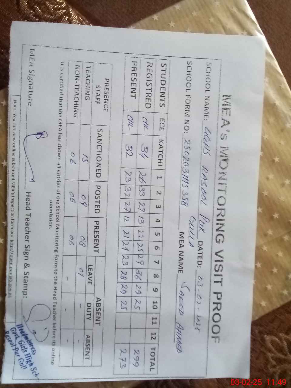 | EMIS Code: 36410494 | Name of School: GGHS RASOOL PUR GULLA, NAWAN SHEHR | |||