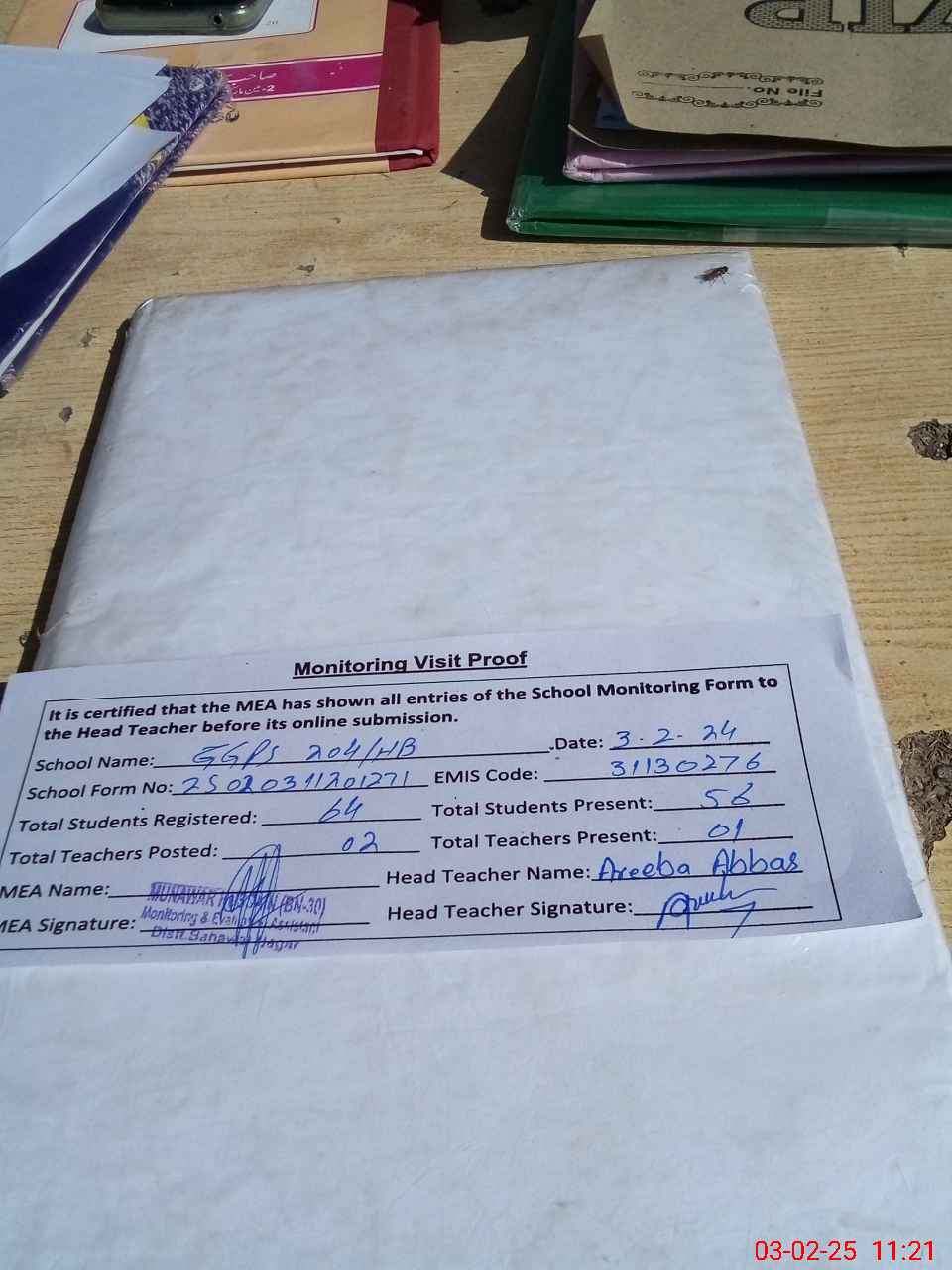 | Attendance Register | Head Teacher | MEA with School | Visit Proof |