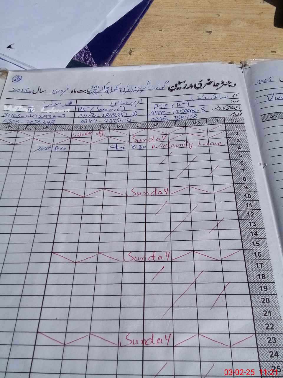 | 31**** | Sa**** Ra**** | PST | Regular | 12 | 0 | 0 | 12 | 0 | 0 | 0 | 0 | 0 | Maternity |