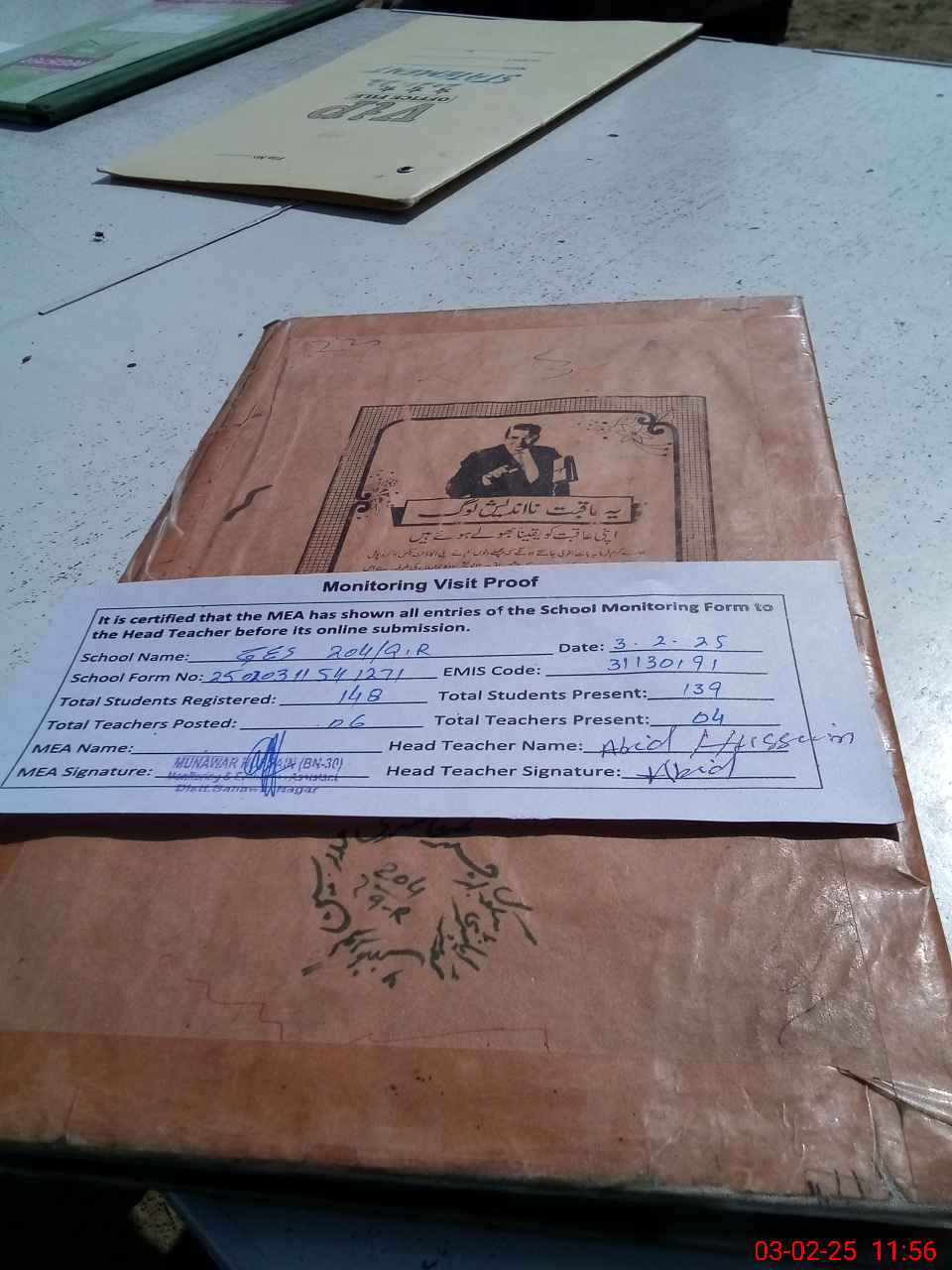 | Attendance Register | Head Teacher | MEA with School | Visit Proof |