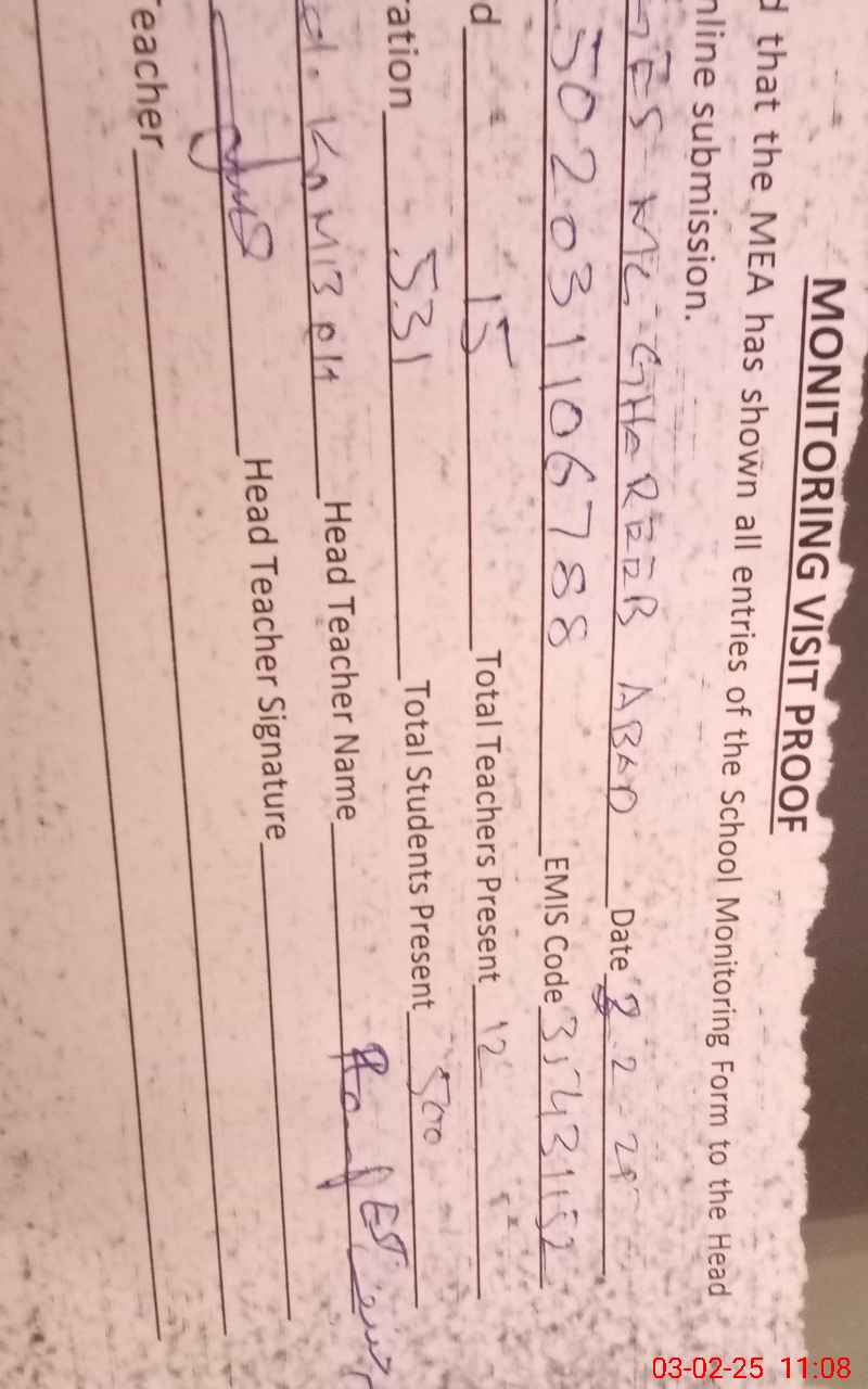 | Attendance Register | Head Teacher | MEA with School | Visit Proof |