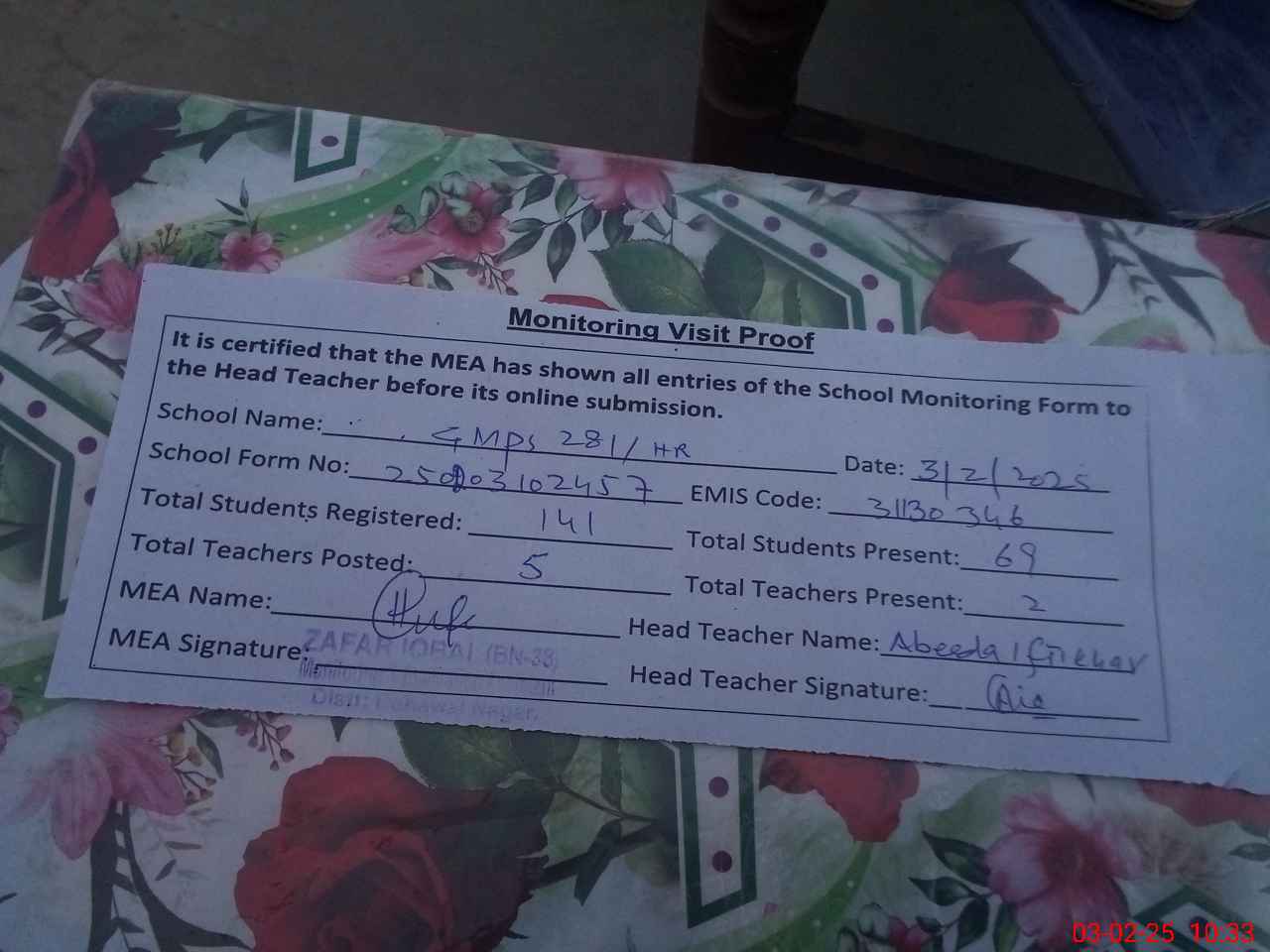 | Attendance Register | Head Teacher | MEA with School | Visit Proof |