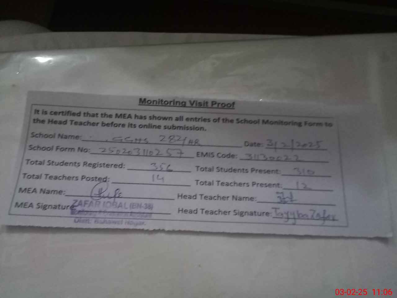 | Attendance Register | Head Teacher | MEA with School | Visit Proof |
