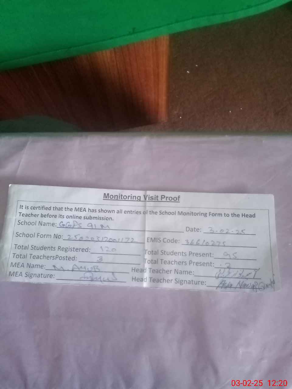 | Attendance Register | Head Teacher | MEA with School | Visit Proof |