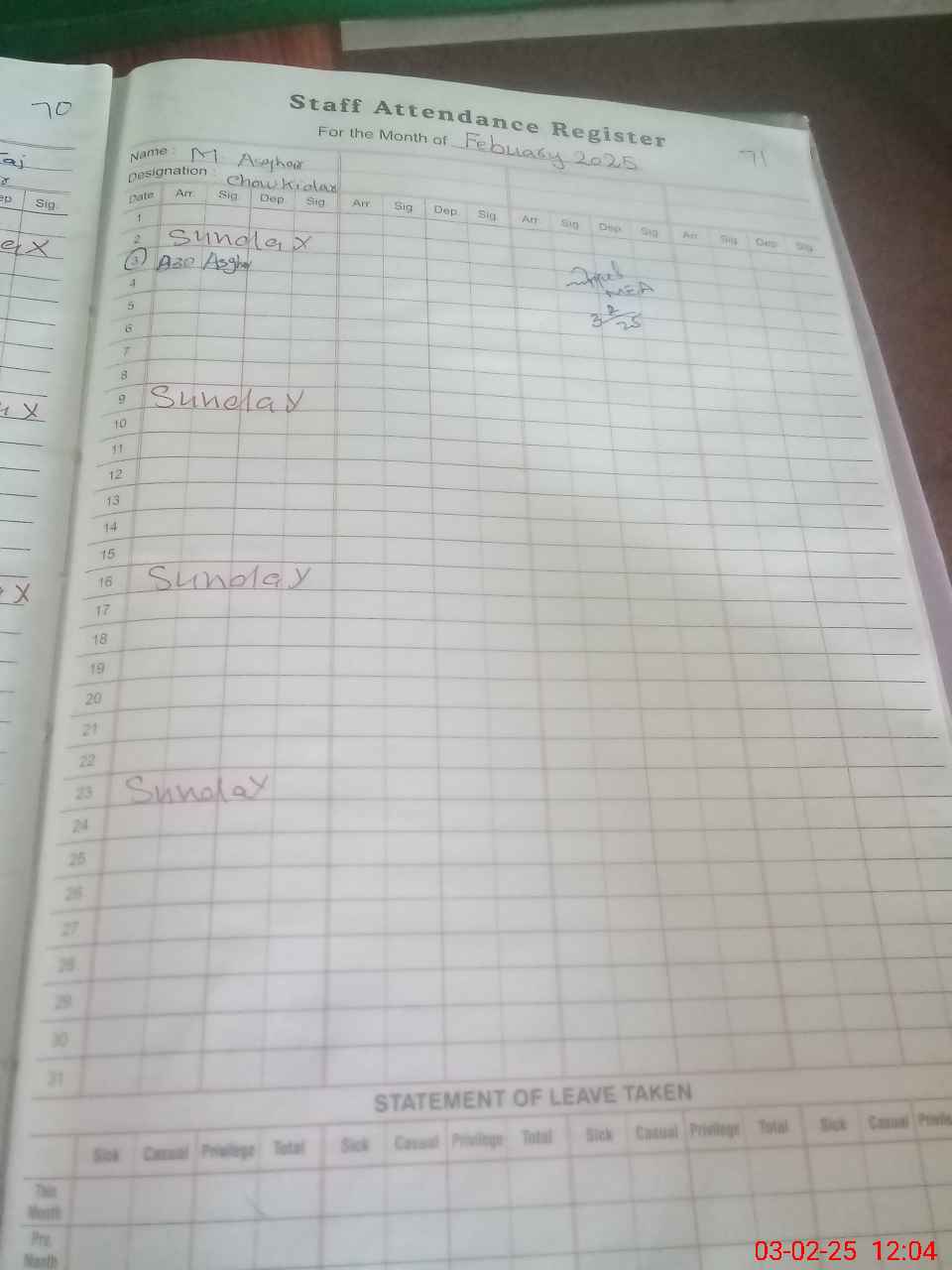 | CNIC | Full Name | Designation | R/C | Absence During Last Calender Month |