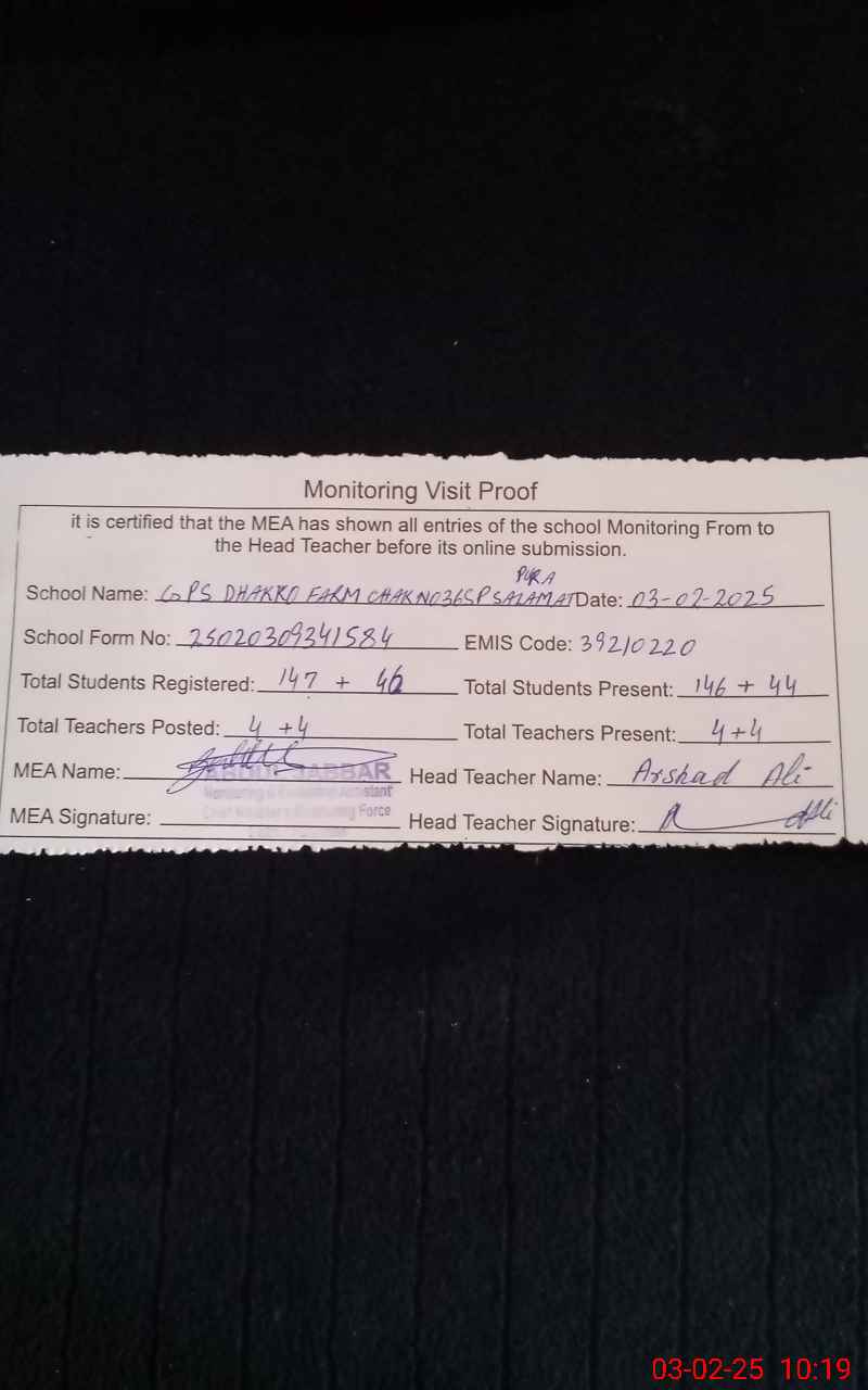 | EMIS Code: 39210220 | Name of School: GPS DHAKKO FARM CHAK NO. 36/SP SALAMAT PURA | |||
