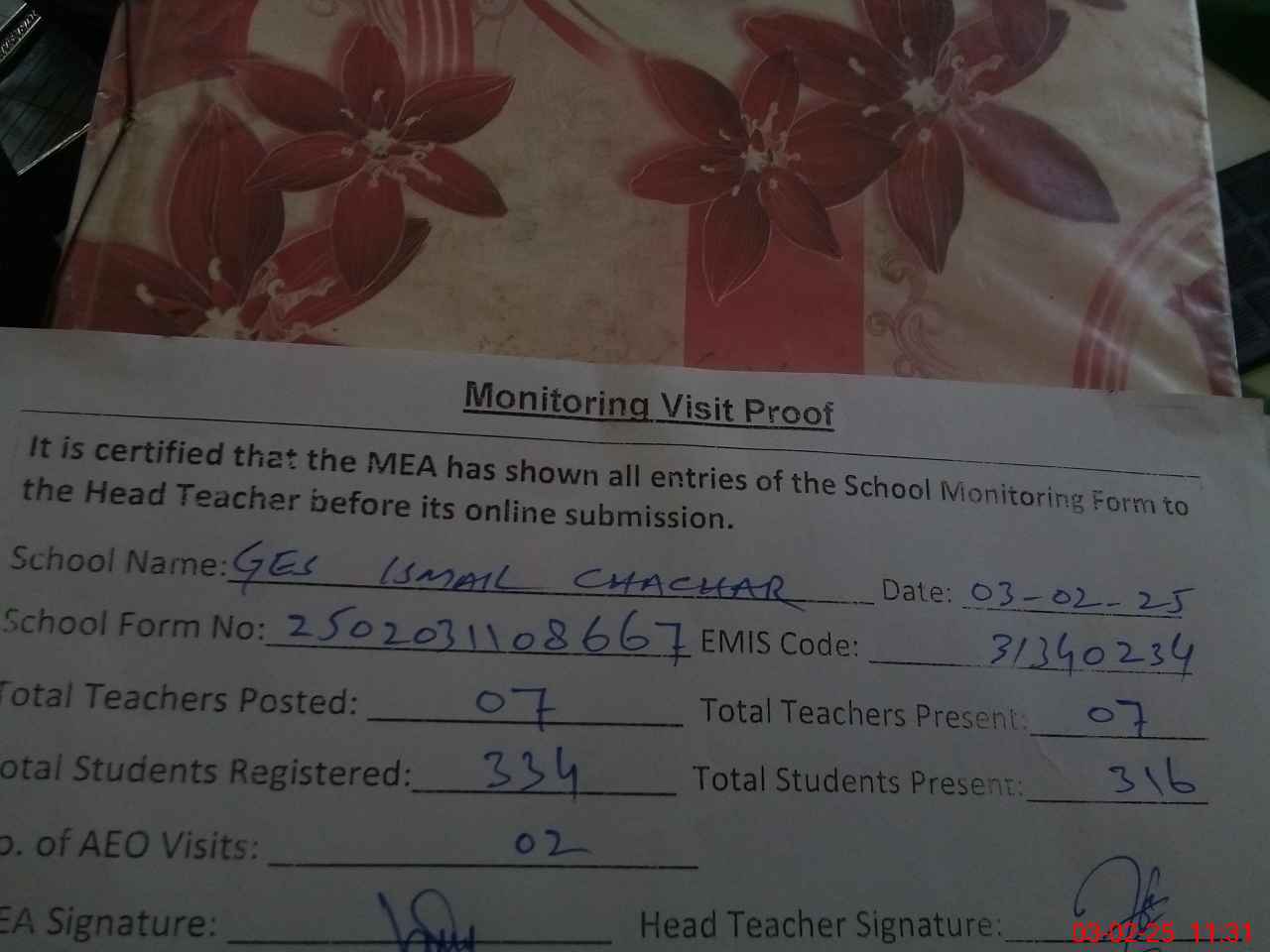 | Attendance Register | Head Teacher | MEA with School | Visit Proof |