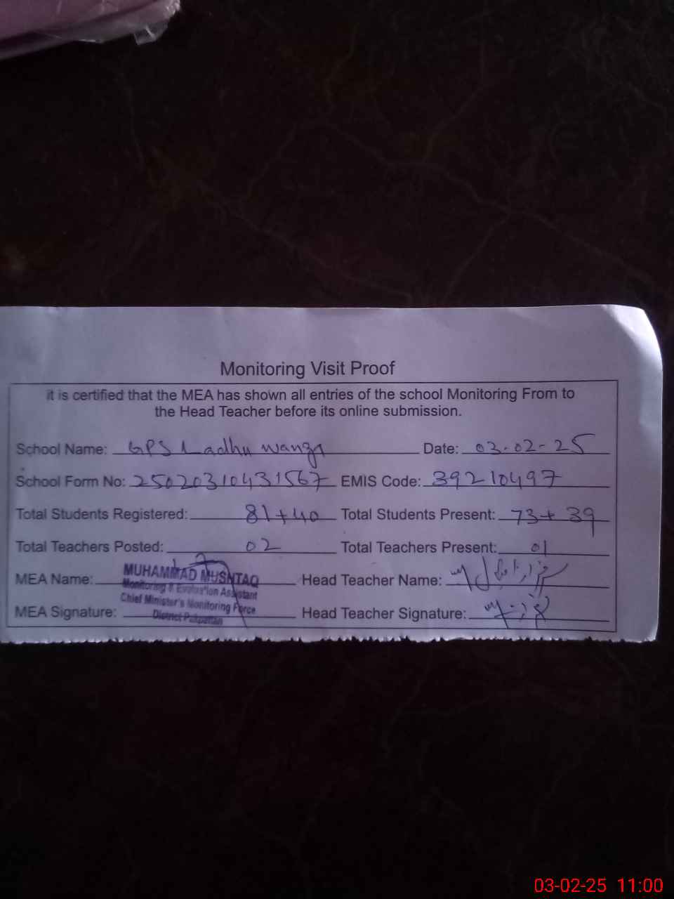 | EMIS Code: 39210497 | Name of School: GPS LADHU WANGA | |||