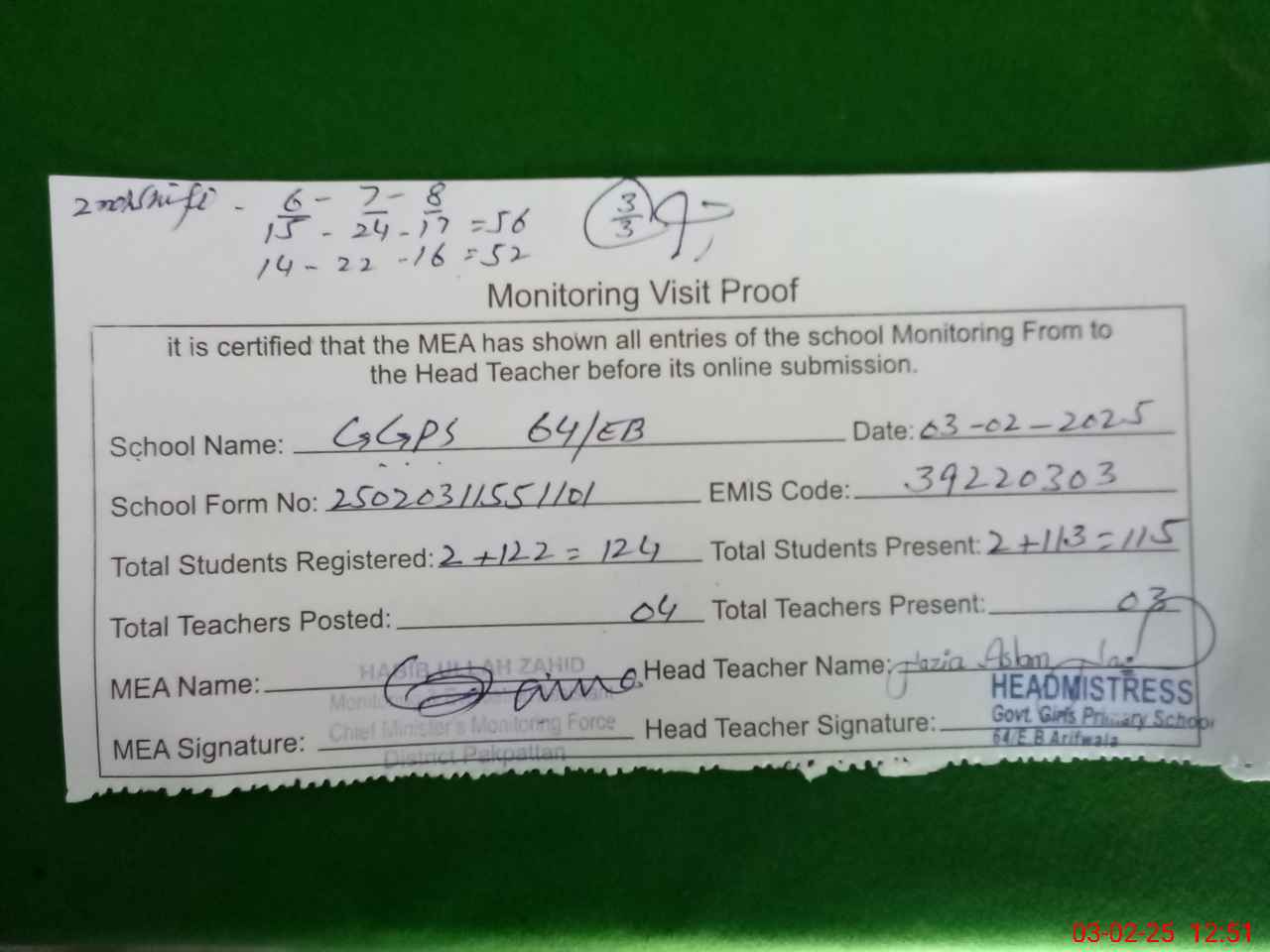 | Monitoring Date: 03-02-2025 | Start Time: 03-02-2025 11:49 AM | End Time: 03-02-2025 12:51 PM | Name of MEA: Ha**** Ul**** Ur**** Ba**** Al**** | |