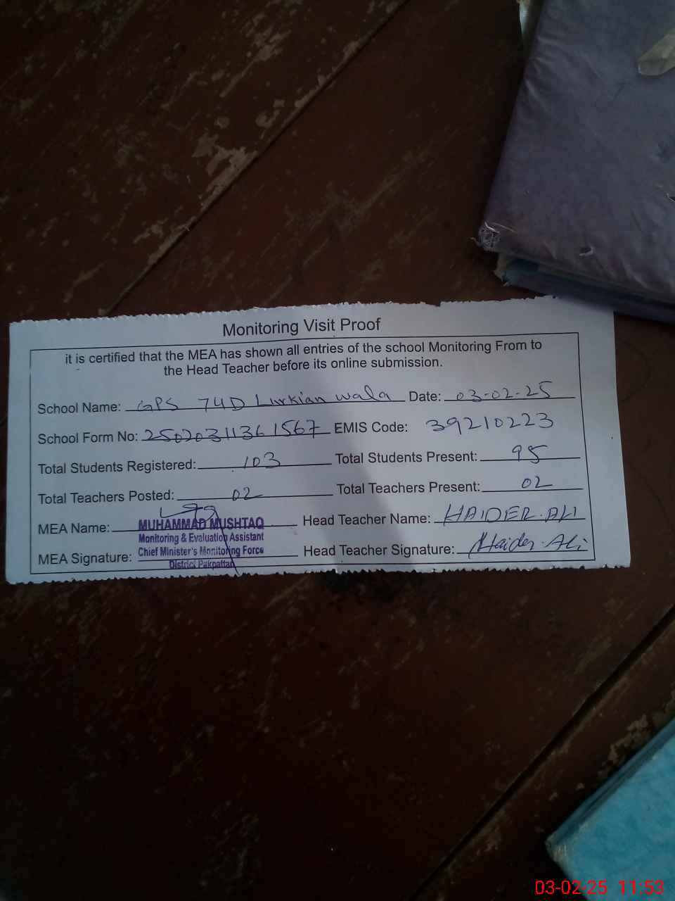 | EMIS Code: 39210223 | Name of School: GPS 74 D LURKIAN WALA | |||