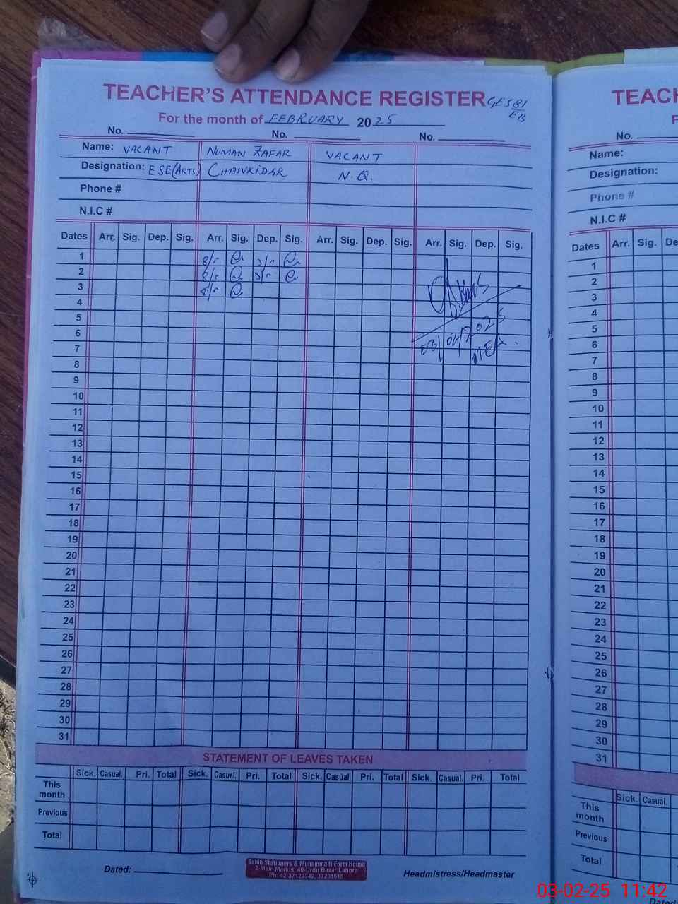 | CNIC | Full Name | Designation | R/C | Absence During Last Calender Month |