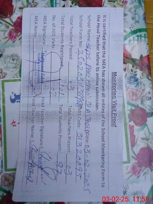 | EMIS Code: 31320095 | Name of School: GPS PAKKI MANDI 31/A JADEED | |||