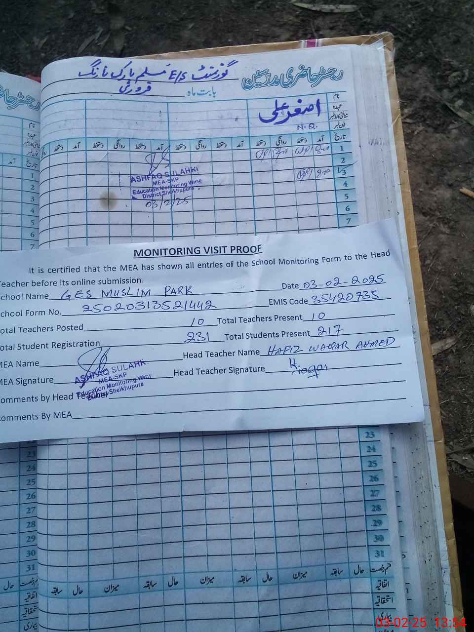 | Attendance Register | Head Teacher | MEA with School | Visit Proof |