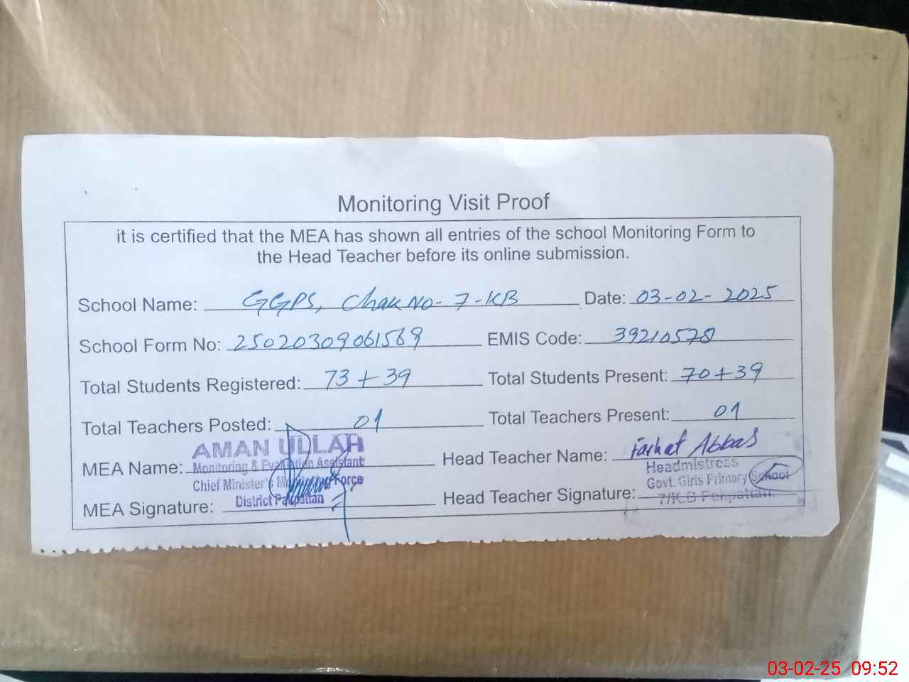| EMIS Code: 39210578 | Name of School: GGPS CHAK NO. 7 KB | |||