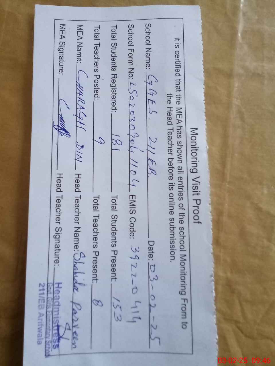 | Attendance Register | Head Teacher | MEA with School | Visit Proof |