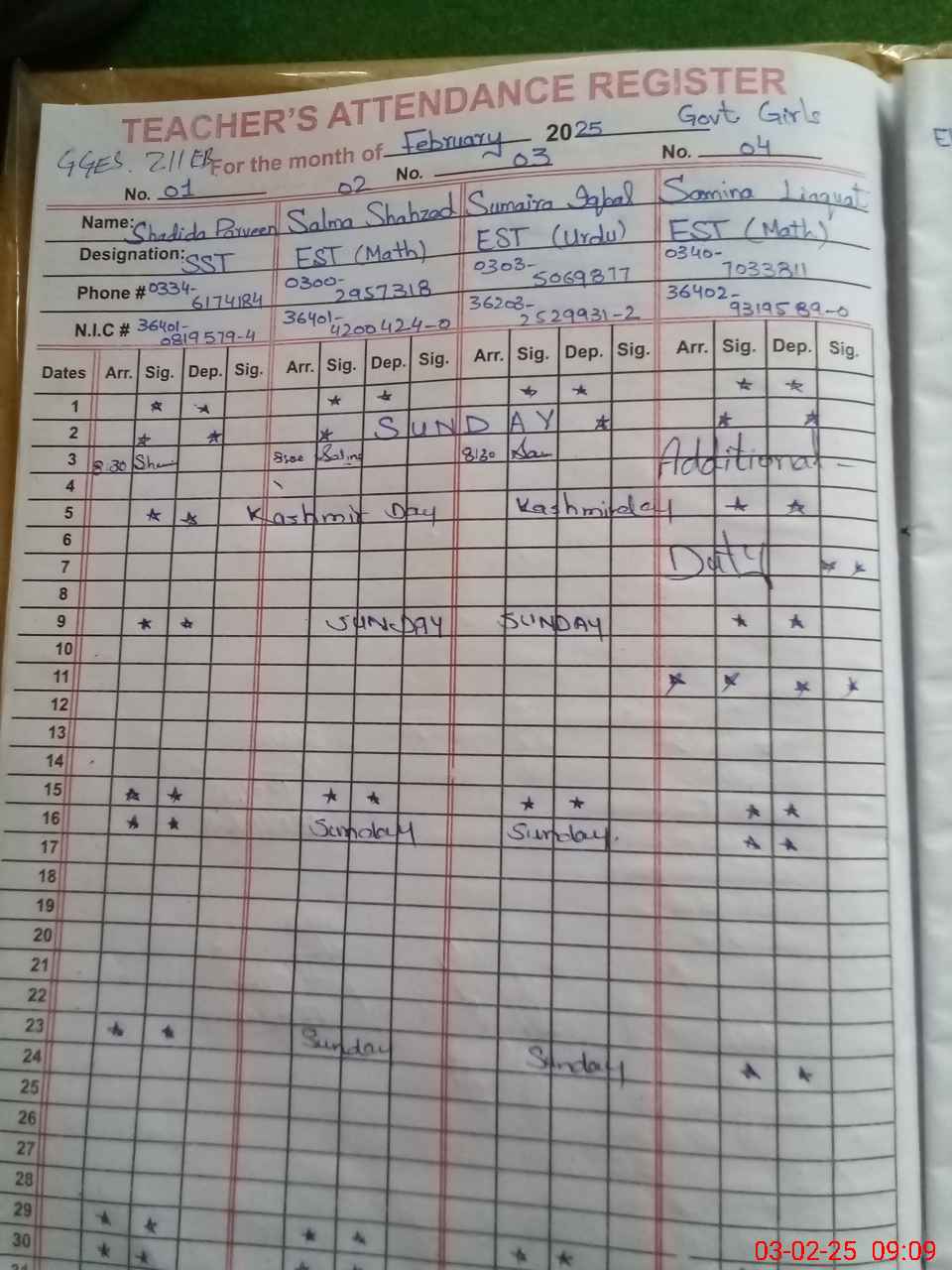| Name: Su**** Iq**** Designation: (School Headmaster's/Headmistress's) Est G Phone/Cell Number: 03**** |