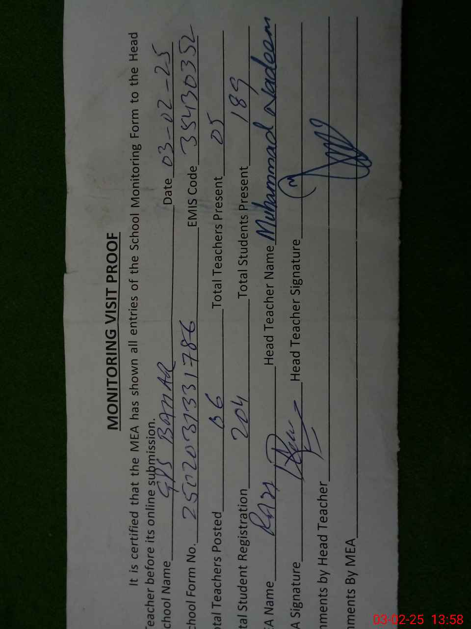 | Attendance Register | Head Teacher | MEA with School | Visit Proof |