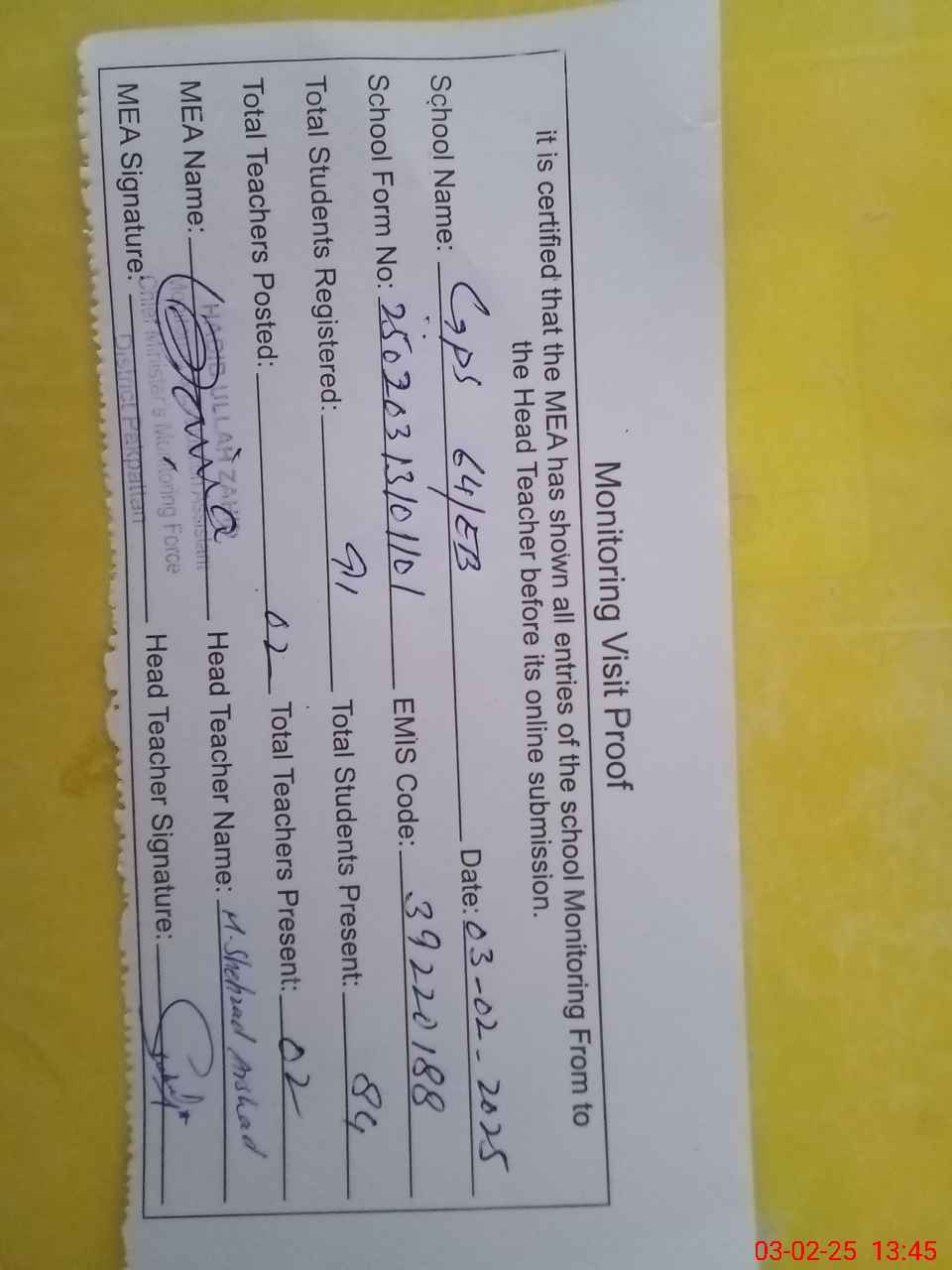 | EMIS Code: 39220188 | Name of School: GPS 64 EB ARIFWALA | |||