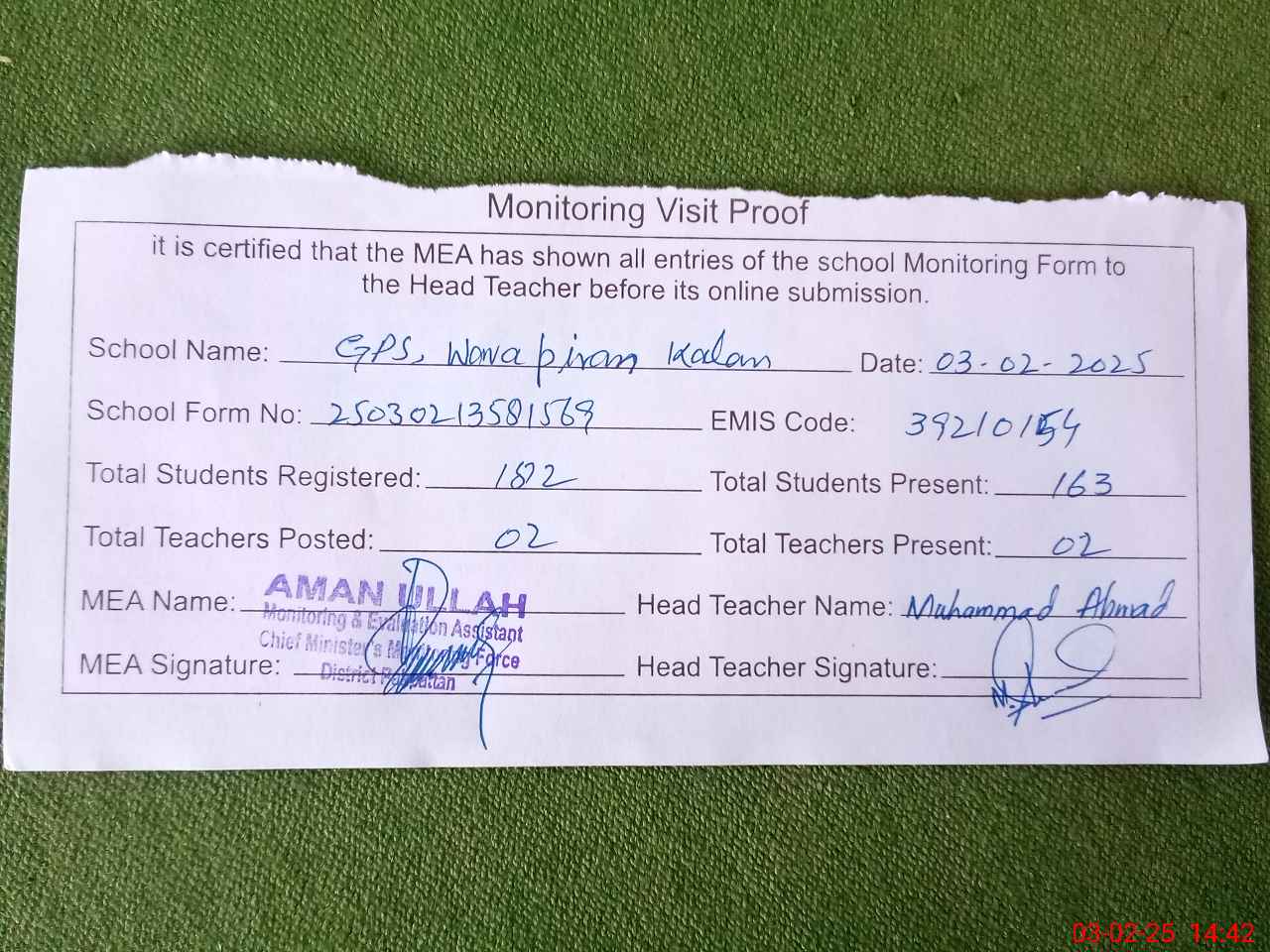 | Attendance Register | Head Teacher | MEA with School | Visit Proof |