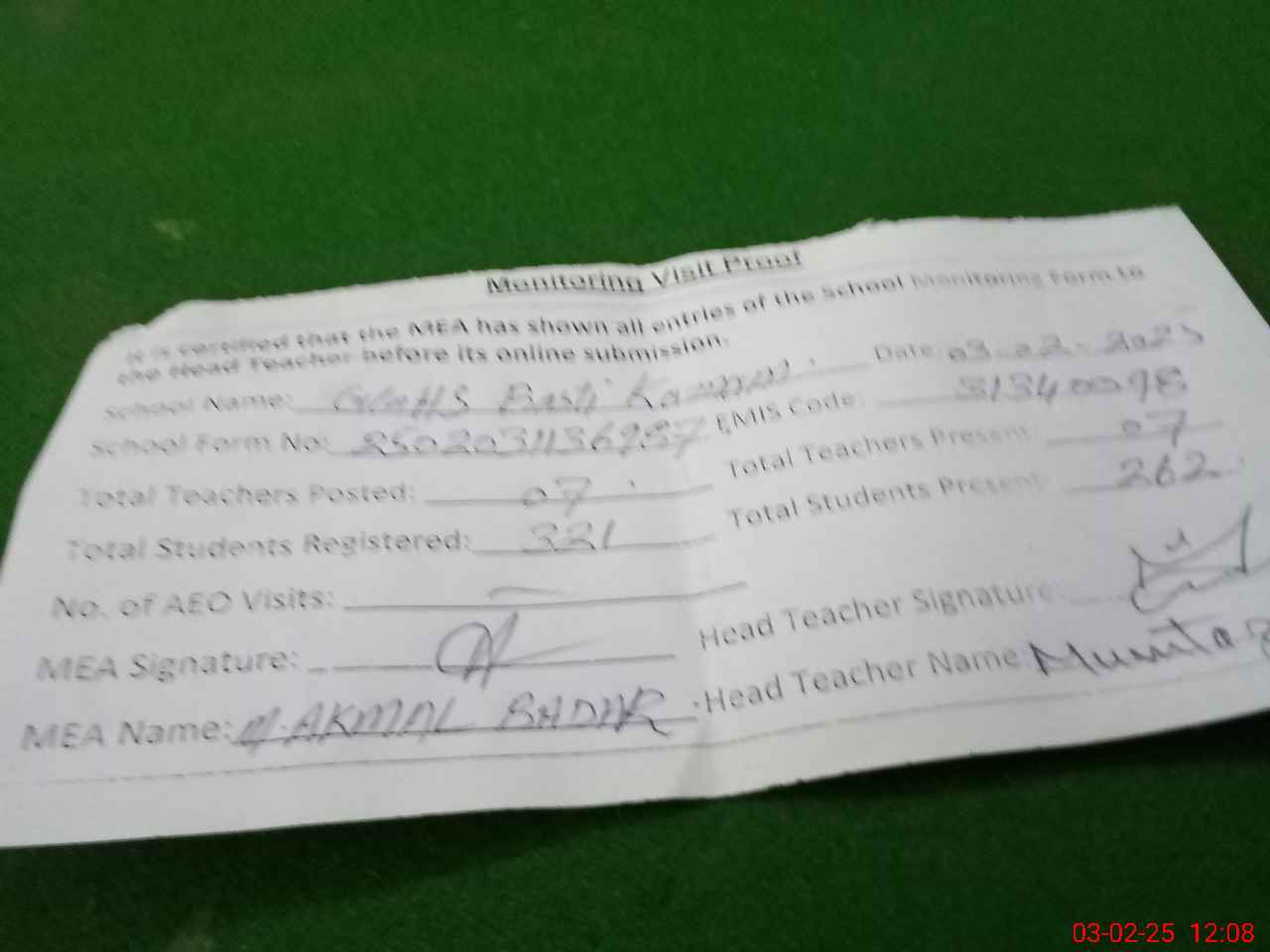| Attendance Register | Head Teacher | MEA with School | Visit Proof |