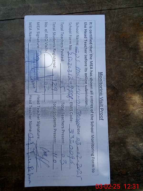 | Attendance Register | Head Teacher | MEA with School | Visit Proof |