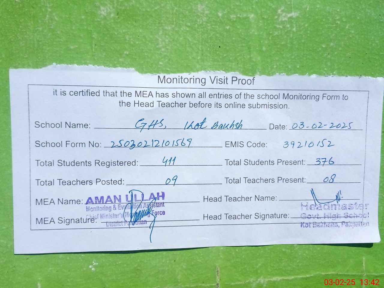 | EMIS Code: 39210152 | Name of School: GHS KOT BAKHSHA | |||