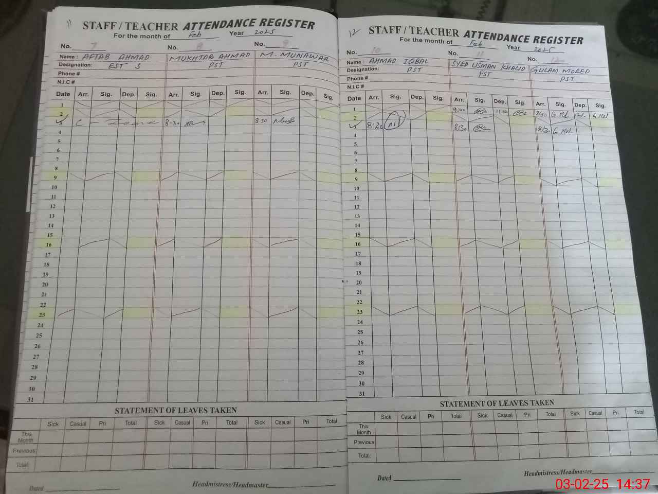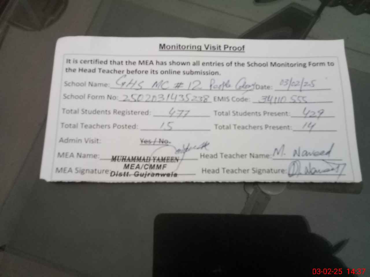 | Attendance Register | Head Teacher | MEA with School | Visit Proof |