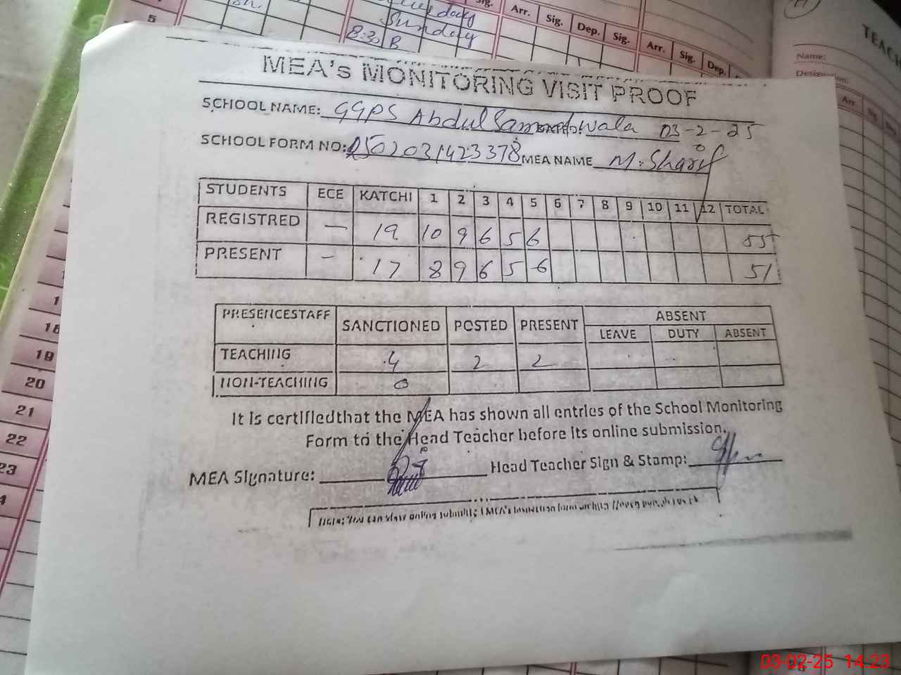 | Attendance Register | Head Teacher | MEA with School | Visit Proof |
