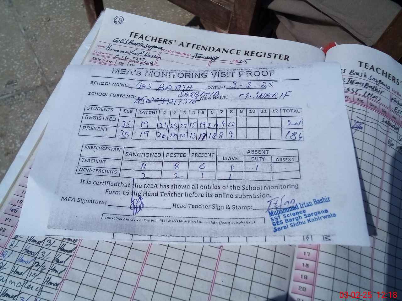 | Attendance Register | Head Teacher | MEA with School | Visit Proof |
