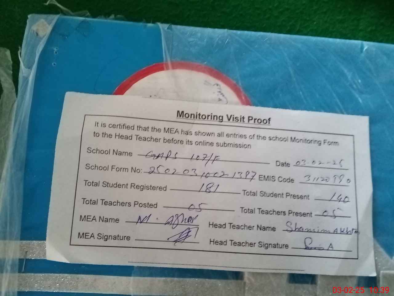 | Attendance Register | Head Teacher | MEA with School | Visit Proof |