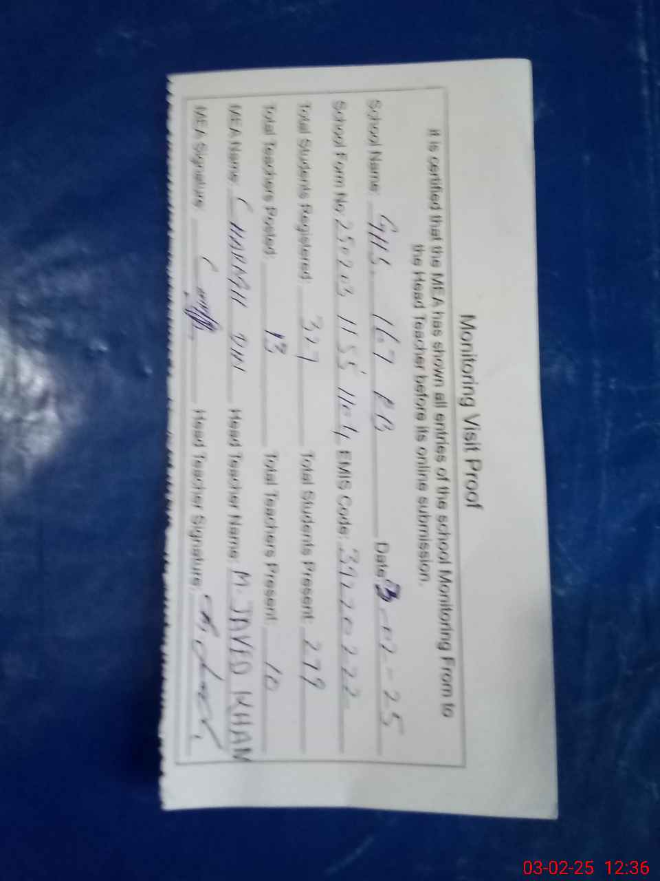 | Attendance Register | Head Teacher | MEA with School | Visit Proof |