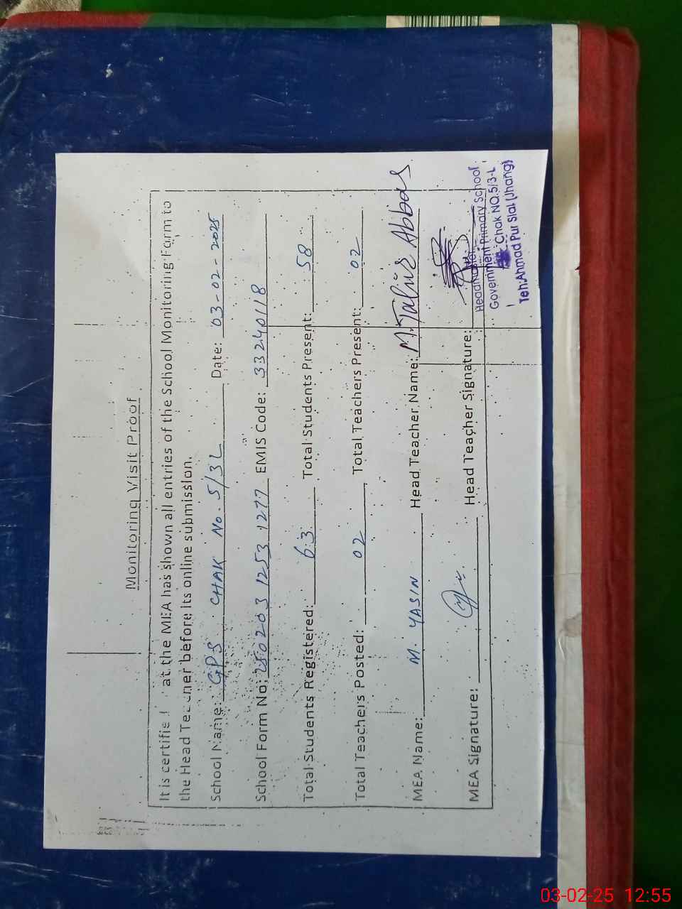 | EMIS Code: 33240118 | Name of School: GPS CHAK NO 5/3 L | |||