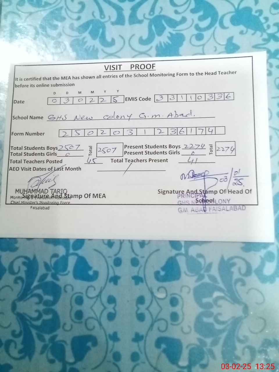 | EMIS Code: 33110336 | Name of School: GHS NEW COLONY GHULAM MUHAMMAD ABAD | |||