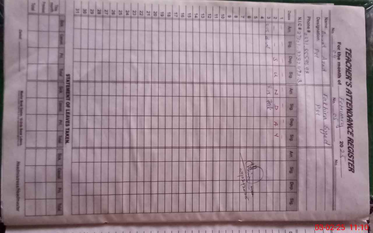 | Name: AM**** ME**** Designation: (School Headmaster's/Headmistress's) HM Phone/Cell Number: 03**** |