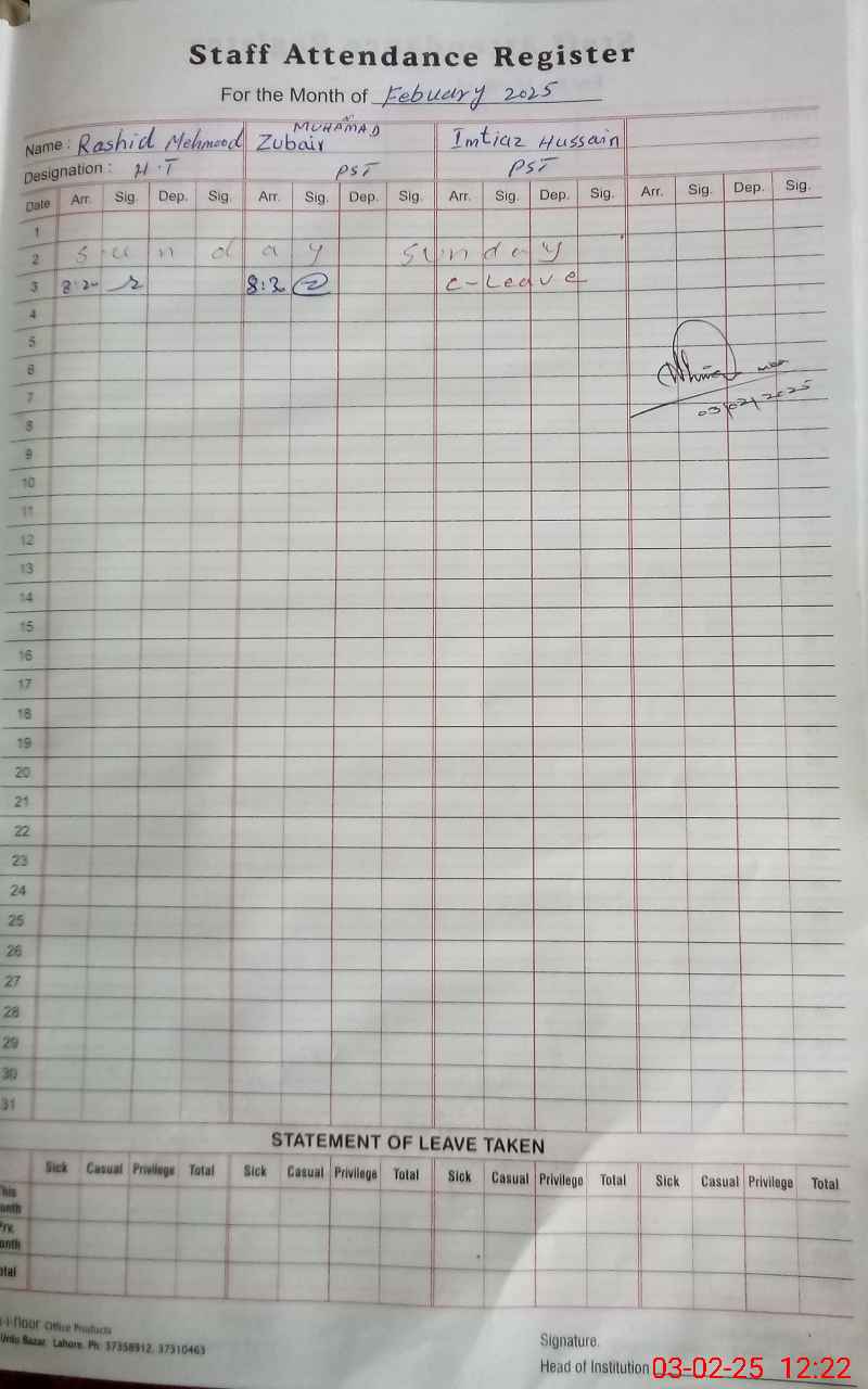 | CNIC | Full Name | Designation | R/C | Absence During Last Calender Month |