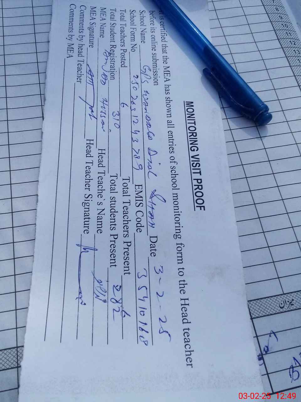 | Attendance Register | Head Teacher | MEA with School | Visit Proof |