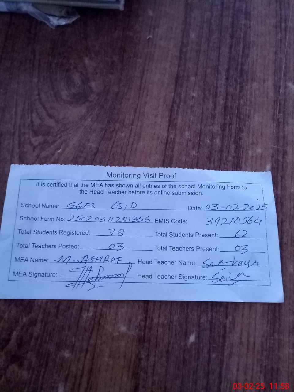 | EMIS Code: 39210564 | Name of School: GGES 65/D NAZIR | |||