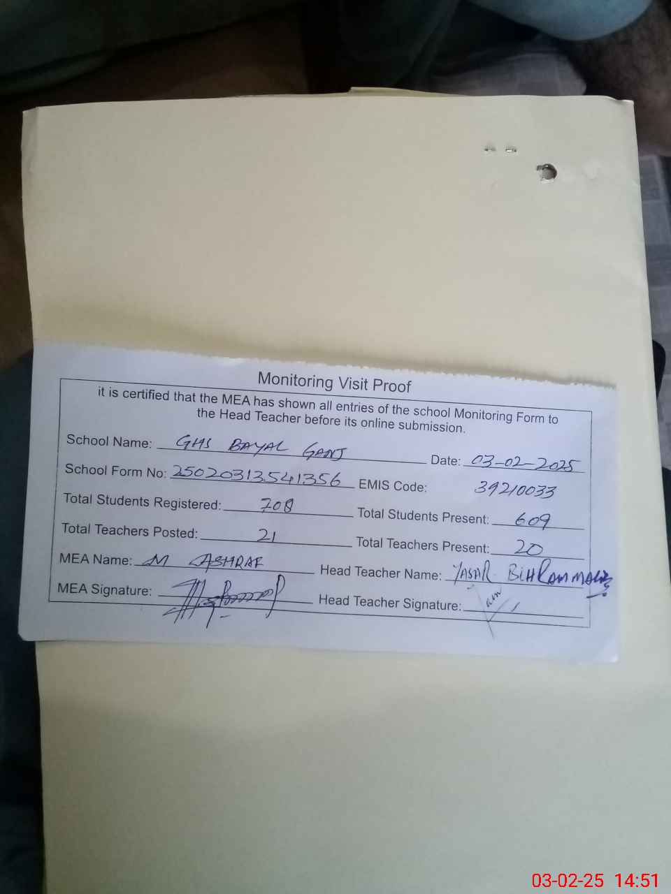 | Attendance Register | Head Teacher | MEA with School | Visit Proof |