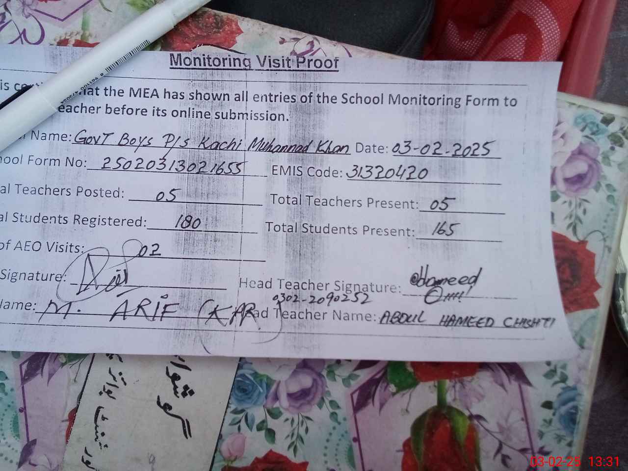 | Name: Mh**** Fa**** Designation: (School Headmaster's/Headmistress's) E S T Phone/Cell Number: 03**** |