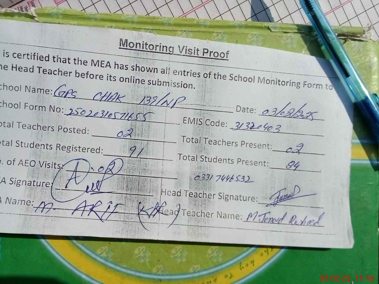 | Attendance Register | Head Teacher | MEA with School | Visit Proof |