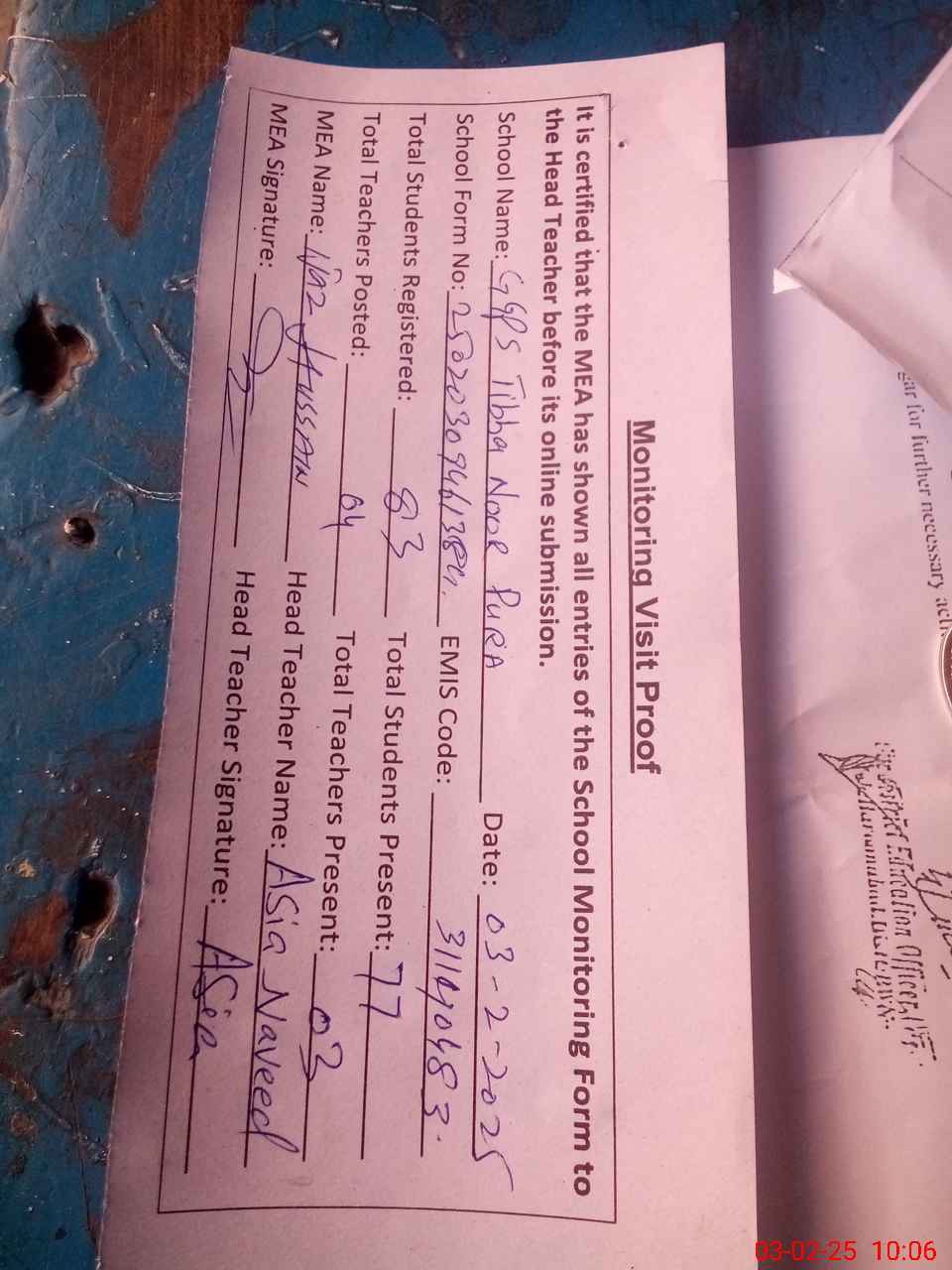 | Certified that this School was Inspected by the Undersigned MEA/DMO Today and the Information Stated Above is as Per Record. | |||||