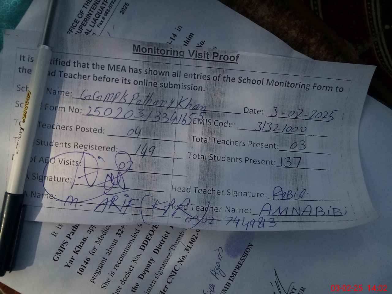 | Attendance Register | Head Teacher | MEA with School | Visit Proof |