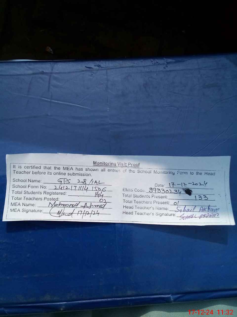 | Attendance Register | Head Teacher | MEA with School | Visit Proof |