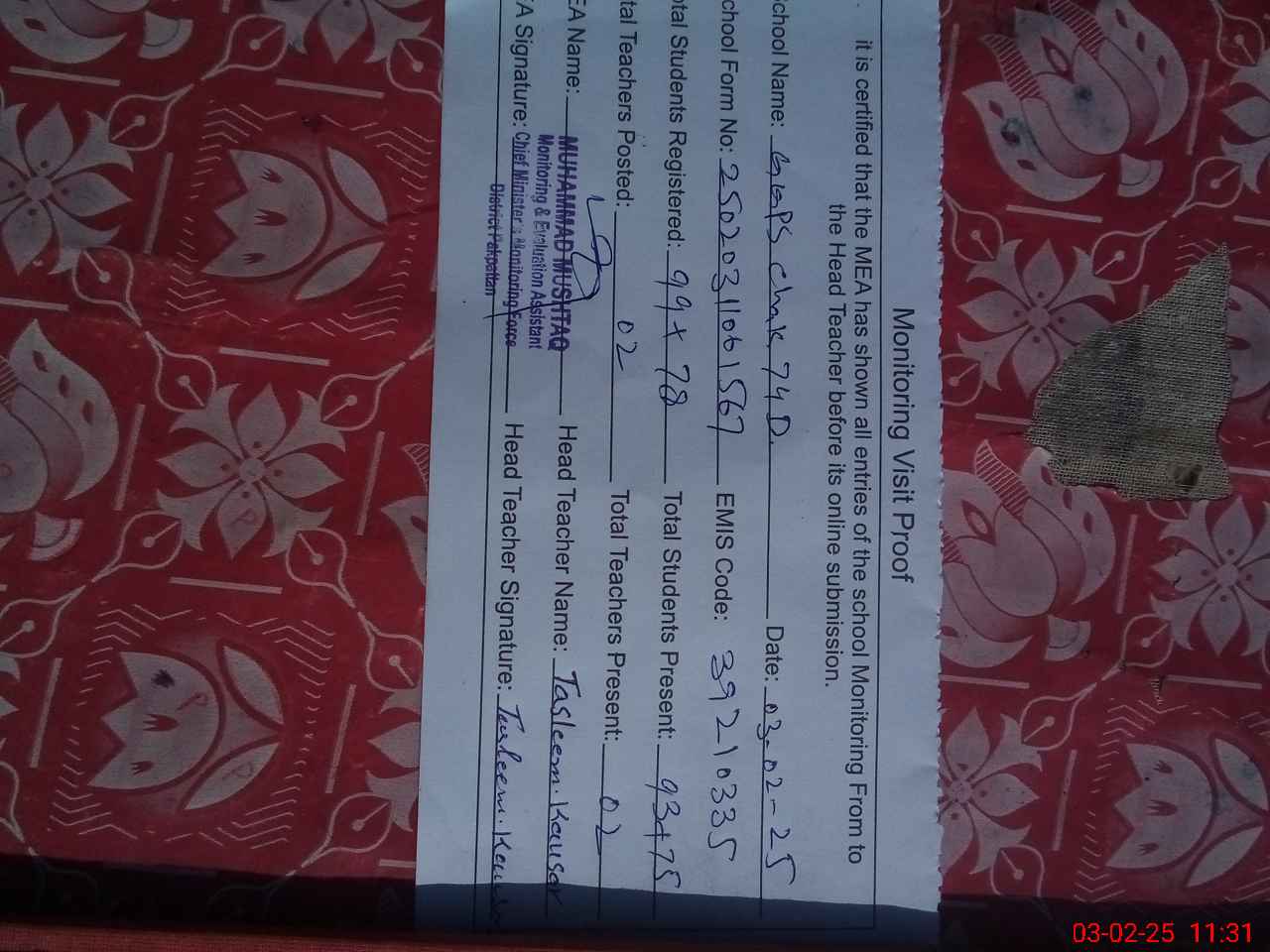 | EMIS Code: 39210335 | Name of School: GGPS CHAK 74/D | |||